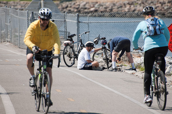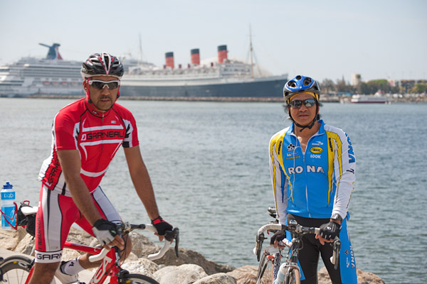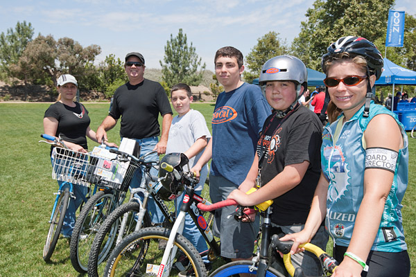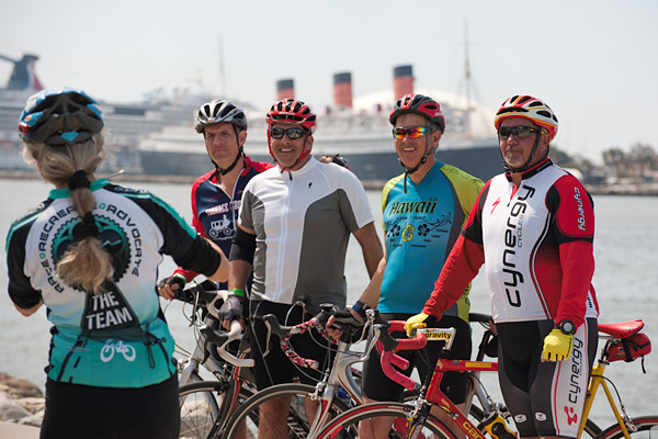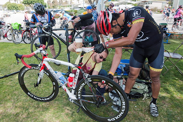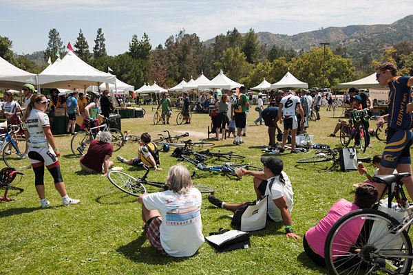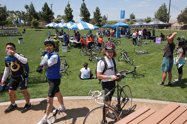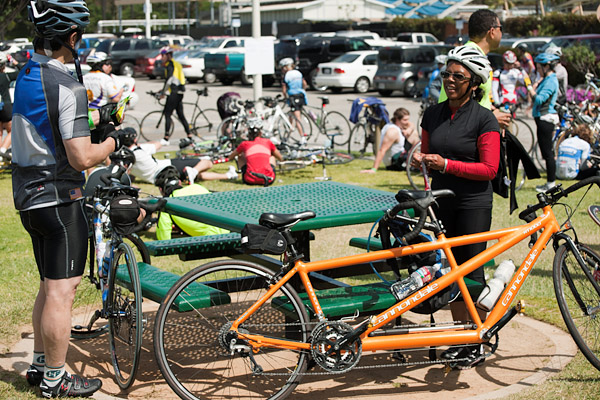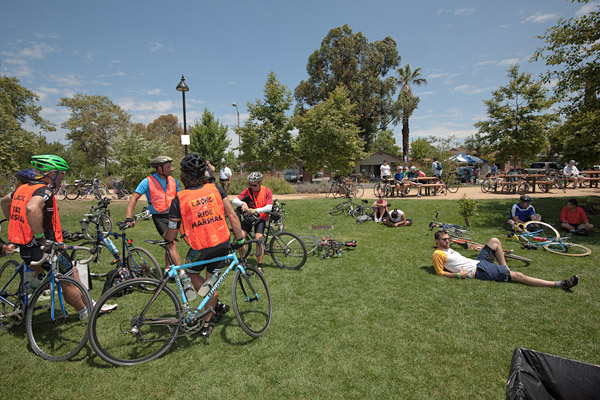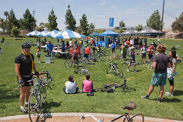 Cyclists rest and prepare for the thirty five mile trip from Long Beach back to Griffith Park as part of the LA River Ride, a fundraiser for the Los Angeles County Bicycle Coalition.