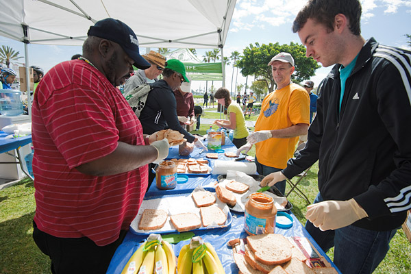 Volunteers prepare peanut butter sandwiches for cyclists at the rest stop at Shoreline Aquatic Park in Long Beach, California.