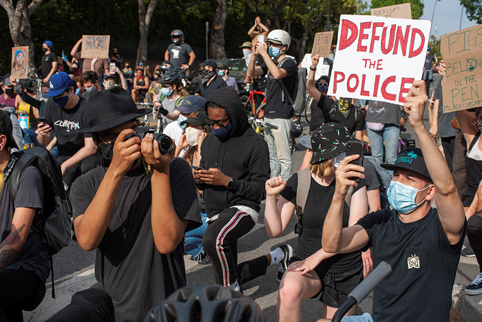 A peaceful march through Hollywood ended in front of the official Los Angeles mayoral residence in Hancock Park. Protestors defied a citywide curfew and threats of violence from the U.S. president to demand an end to police killings and the reduction of police budgets.